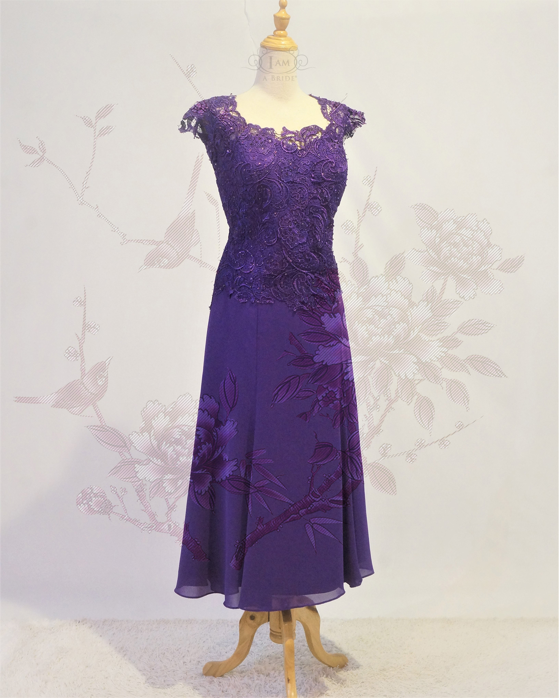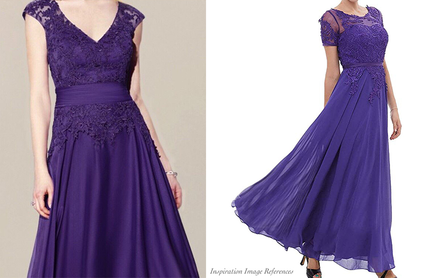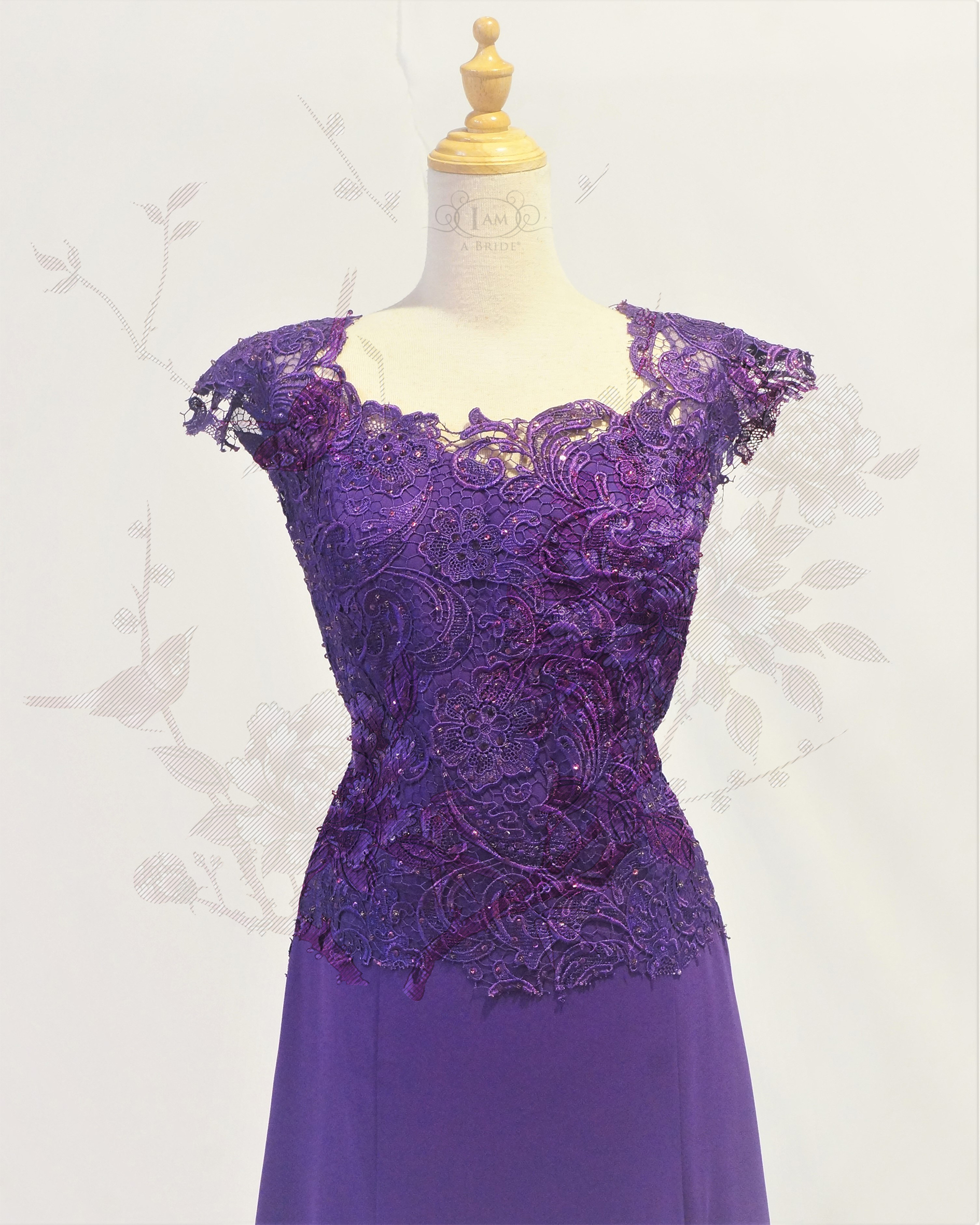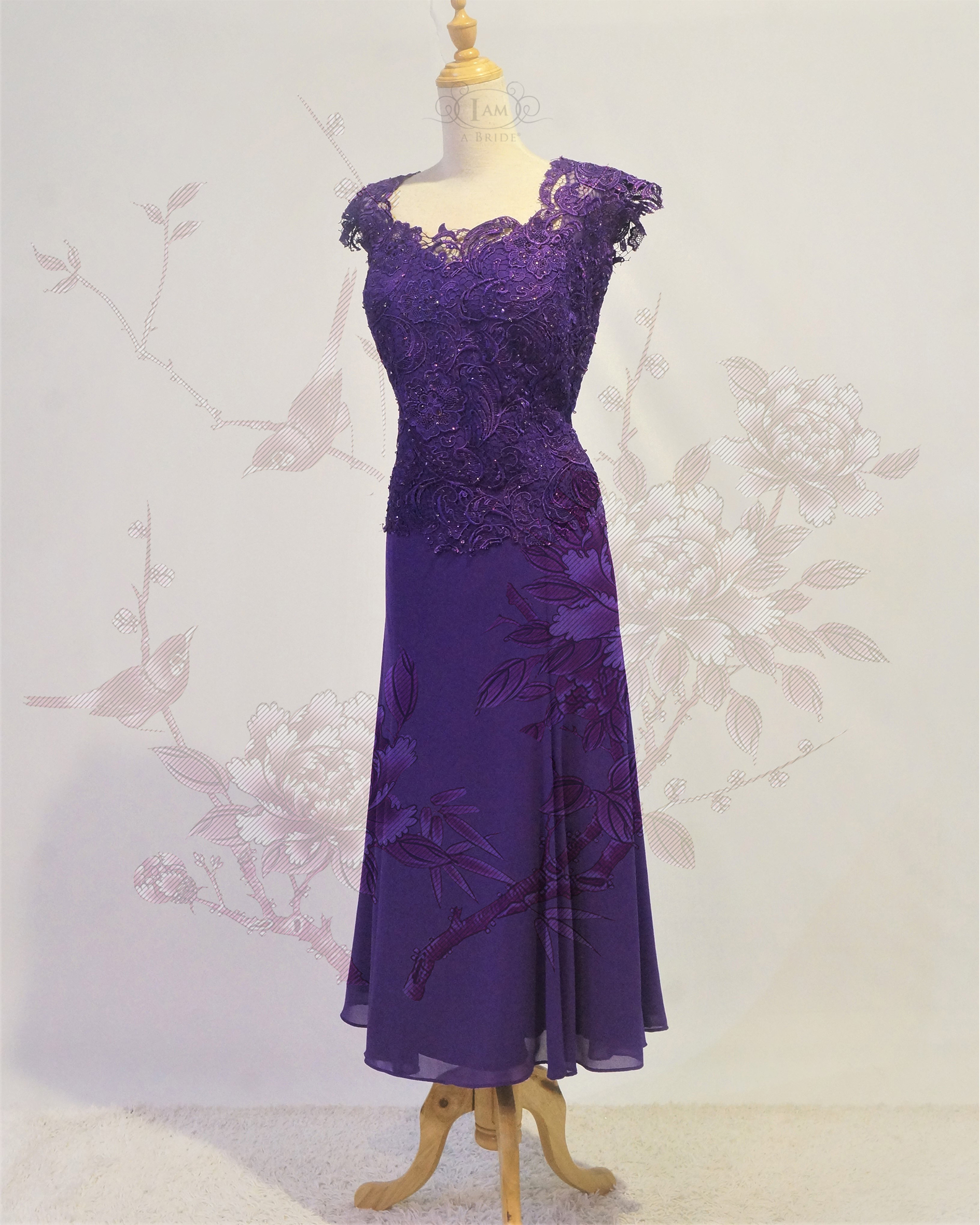 [Tailor Made] Purple Venetian Lace Chiffon Skirt Mid Length Dinner Dress Evening Wear.