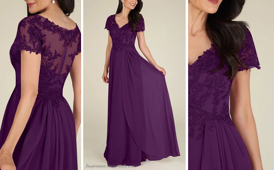 Sheer Venetian lace cut-out edges neckline and cap sleeves, A-line mid-length dress with patch laces bodice and flowy chiffon skirt overlay.
